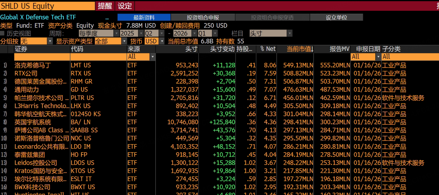 规模较大、收益较高的军工ETF是 $Global X Defense Tech ETF(SHLD)$ ,目前规模超69亿美元,管理费率为0.49%,略高于ITA,不过持仓股较为分散,最大持仓股为 $洛克希德马丁(LMT)$ ,占净值的8%,比ITA正常多了,而且,SHLD还有一个很大的优点,是持仓股中还有欧洲的军工企业,如第三大持仓股为德国莱茵,占净值的7.3%: