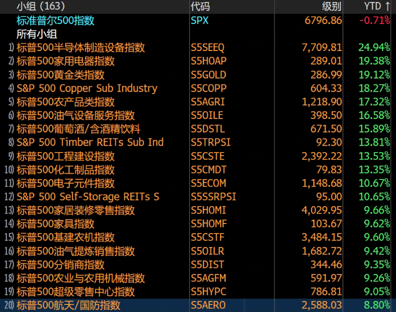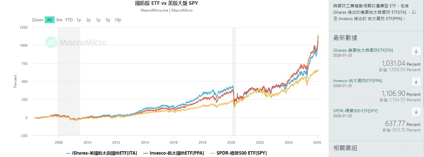 军工ETF的表现更是亮眼,其中, $Global X Defense Tech ETF(SHLD)$ 年内涨超18.8%、 $SPDR S&P Aerospace & Defense ETF(XAR)$ 涨超17.7%、 $First Trust Indxx Aerospace & Defense ETF(MISL)$ 涨超16.4%、 $iShares Dow Jones U.S. Aerospace(ITA)$ 涨超10.8%: