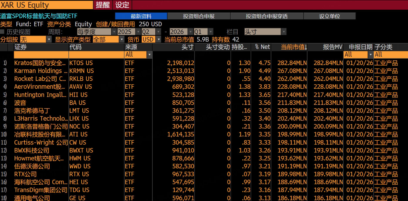 $SPDR S&P Aerospace & Defense ETF(XAR)$ 最大的优势是管理费低,只有0.35%,而且持仓很分散,第一大持仓股是 $克瑞拓斯安全防卫(KTOS)$ ,市值只有217亿美元,相比其他几个大哥,偏爱小盘军工: