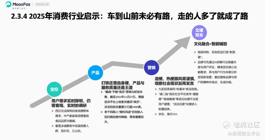 ●“爱你老己”的社会心理:源自游戏台词空耳的“爱你老己”梗在年底爆火,反映了年轻人拒绝过度内卷、回归自我关爱的心理诉求。品牌若能切中这种“自爱而不自怜”的情绪,便能获得巨大的品牌认同。在宏观“修复期”的背景下,消费者的钱袋子捂得更紧了,但为情绪买单的意愿却更强了。“爱你老己”成为网络热梗,折射出年轻人从取悦他人向取悦自我的转变。