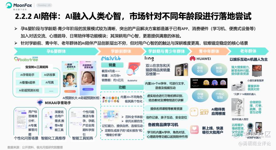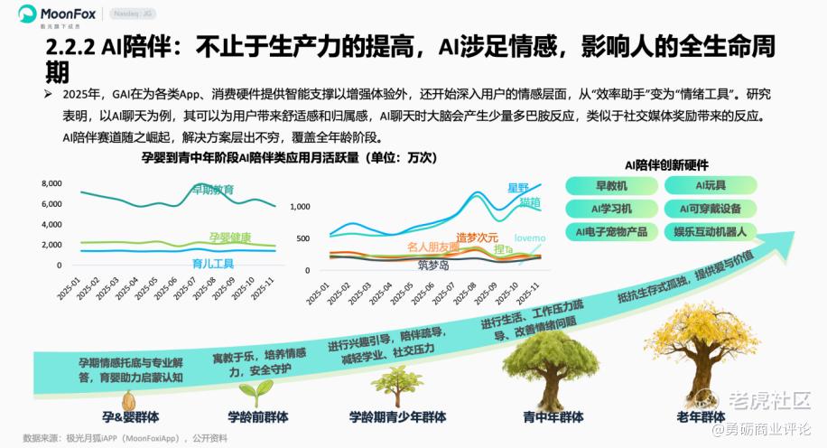 AI 陪伴赛道全面崛起,覆盖孕婴、学龄期青少年、青中年、老年全年龄阶段,从孕期情感托底、青少年心理疏导到老年陪伴聊天,AI 成为重要的 "情绪工具",相关应用月活跃量持续攀升。
