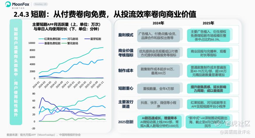 月狐数据发布的《2025年互联网年度盘点研究报告》显示,短剧在2025年完成了从“土味视频”到“精品内容”的华丽转身。细分赛道呈现差异化竞争态势:短剧行业用户流量向头部集中,制作成本从 30 万起步升至 40-70 万元 / 部,精品剧数量显著增加,盈利模式涵盖广告植入、付费点播、版权出售等,"新中式"+AI 译制推动短剧出海规模超百亿人民币。