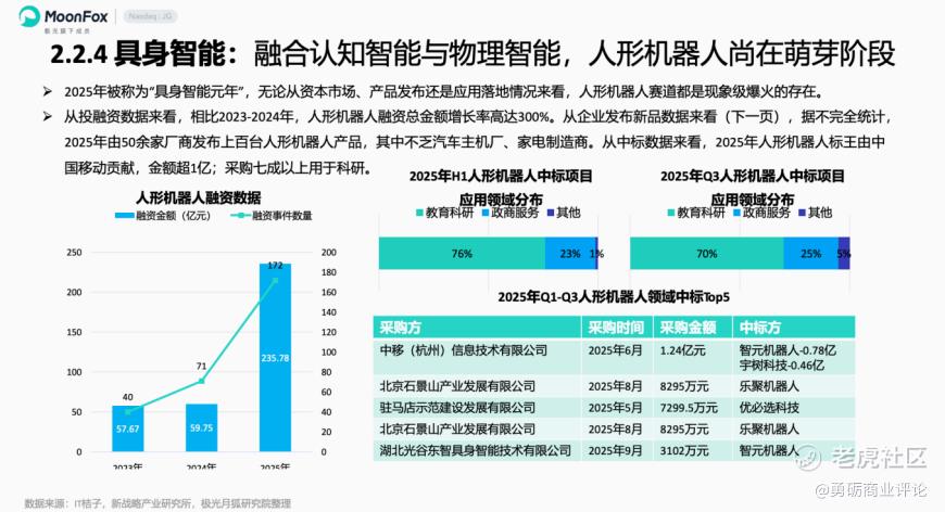 具身智能成为 2025 年现象级赛道,被称为 "具身智能元年"。该领域融资总金额较 2023-2024 年增长率高达 300%,50 余家厂商发布上百台人形机器人产品,涵盖汽车主机厂、家电制造商等多元主体。中国移动以 1.24 亿元采购金额成为年度标王,采购量七成以上用于科研。