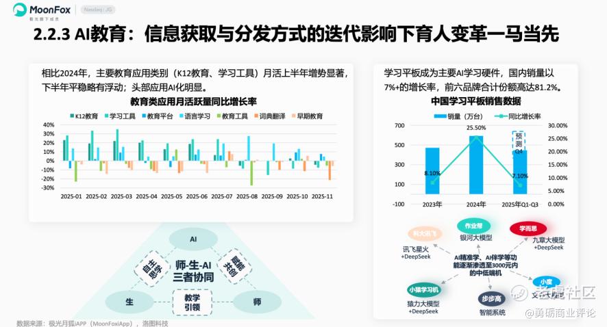 教育领域成为人机共智的核心落地场景,K12 教育、学习工具类应用月活上半年增势显著,头部应用 AI 化特征明显。学习平板作为核心硬件,国内销量增长率超 7%,前六品牌合计份额达 81.2%,AI 精准学、AI 伴学等功能已渗透至 3000 元内中低端机型。
