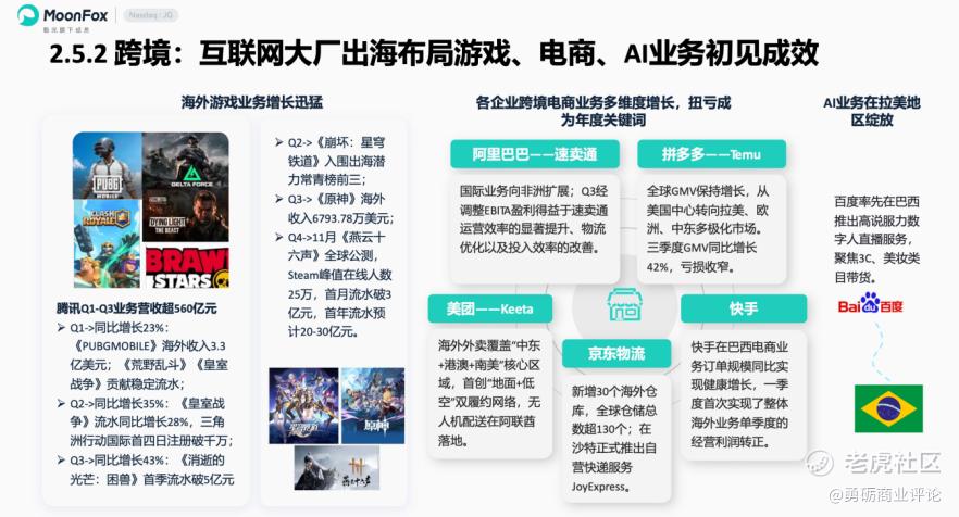 月狐数据发布的《2025年互联网年度盘点研究报告》显示,跨境布局成效显著,互联网大厂出海聚焦游戏、电商、AI 三大核心业务。腾讯游戏《原神》Q3 海外收入 6793.78 万美元,《燕云十 六声》首月流水破 3 亿元;拼多多 Temu 全球 GMV 同比增长 42%,从美国中心转向多极化市场;百度在巴西推出高说服力数字人直播服务,快手巴西电商业务实现单季度盈利转正。出海模式从单一产品输出向 "产品 + 服务 + 价值链" 全生态输出升级,深度本地化与 AI 赋能成为核心竞争力。