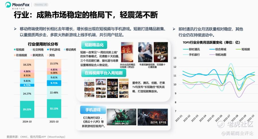其次,用户行为层面,移动终端使用时长同比增长,短视频(32.12%)、手机游戏(22.48%)成为核心增长极。短剧行业向精品化转型,央台出品的《奇迹》斩获数十亿播放量,爱奇艺、腾讯等头部平台纷纷布局 "长短融合" 战略;《三角洲行动》《燕云十六声》等新游戏上线带动手机游戏用户粘性提升。即时通讯行业月活跃量保持稳定,而移动购物、在线视频等行业仍处于波动调整中。