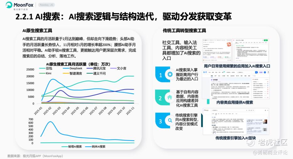 ●AI搜索的重构:传统的“关键词-链接”搜索模式正在被“意图识别-直接答案”的AI搜索取代。百度、夸克等平台纷纷转型,DeepSeek、Kimi等原生AI助手更是凭借精准的推理能力抢占了大量用户心智。这标志着互联网流量分发的逻辑发生了根本性改变——用户不再需要浏览网页,而是直接获取经过AI消化处理后的信息。