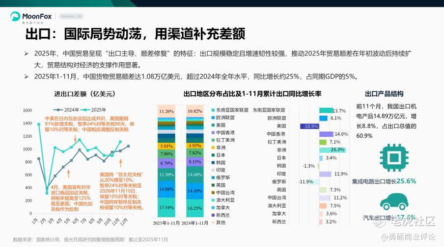 在内需修复缓慢的同时,外贸成为2025年经济最大的亮点。前11个月,中国货物贸易顺差达到了惊人的1.08万亿美元,同比增长约25%,创下历史新高 。