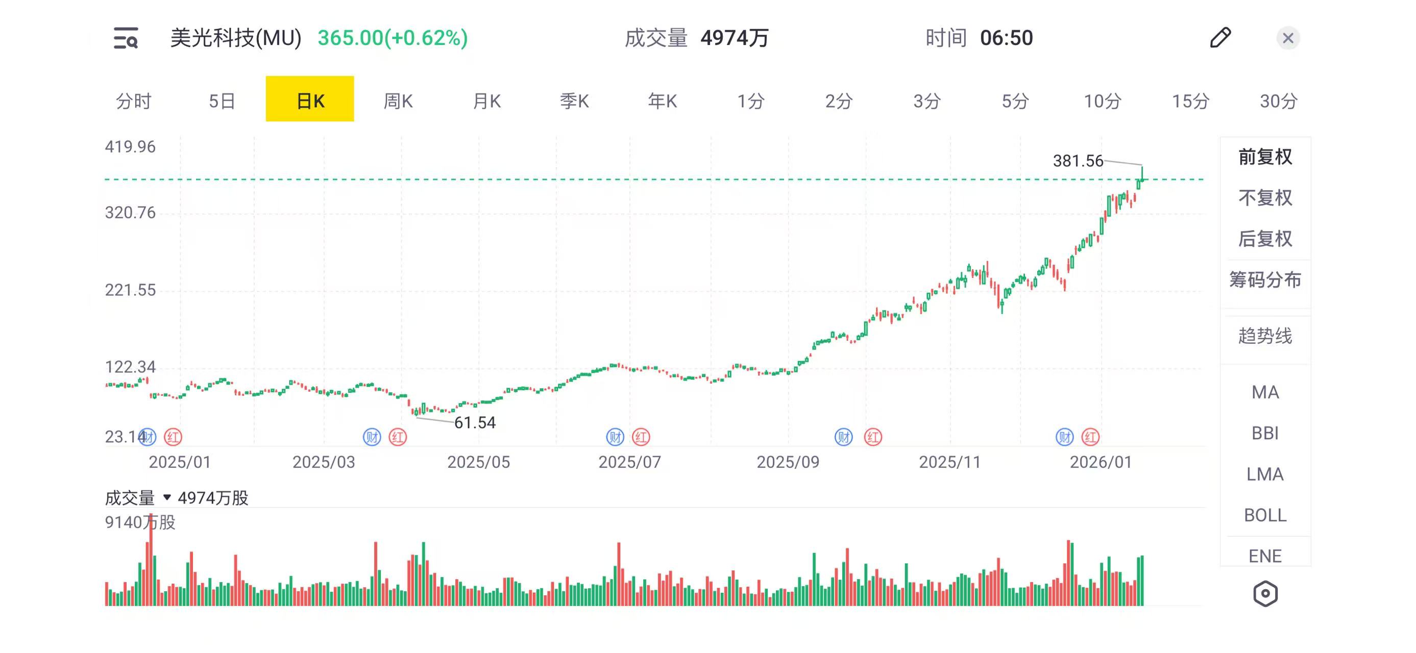 过去一年,内存股本来最容易被贴上“周期、涨价、崩盘”的标签,市场也一直在吵:美光涨这么多是不是又到顶了、30倍P/E是不是泡沫、下一轮供给一扩就完了……但就在最近几个月,AI推理需求加速落地、云厂商把内存配置往上拉、HBM与高端DRAM一路紧缺,直接把“周期逻辑”改写成“AI基础设施逻辑”,市场情绪也被彻底点燃——有虎友抄底美光大赚29万美元。这篇文章就带大家一起复盘他的“发财瞬间”,也顺便聊聊:这轮美光为什么能这么猛?背后到底发生了什么。 $美光科技(MU)$