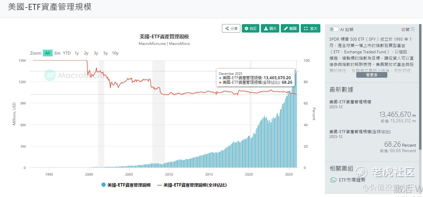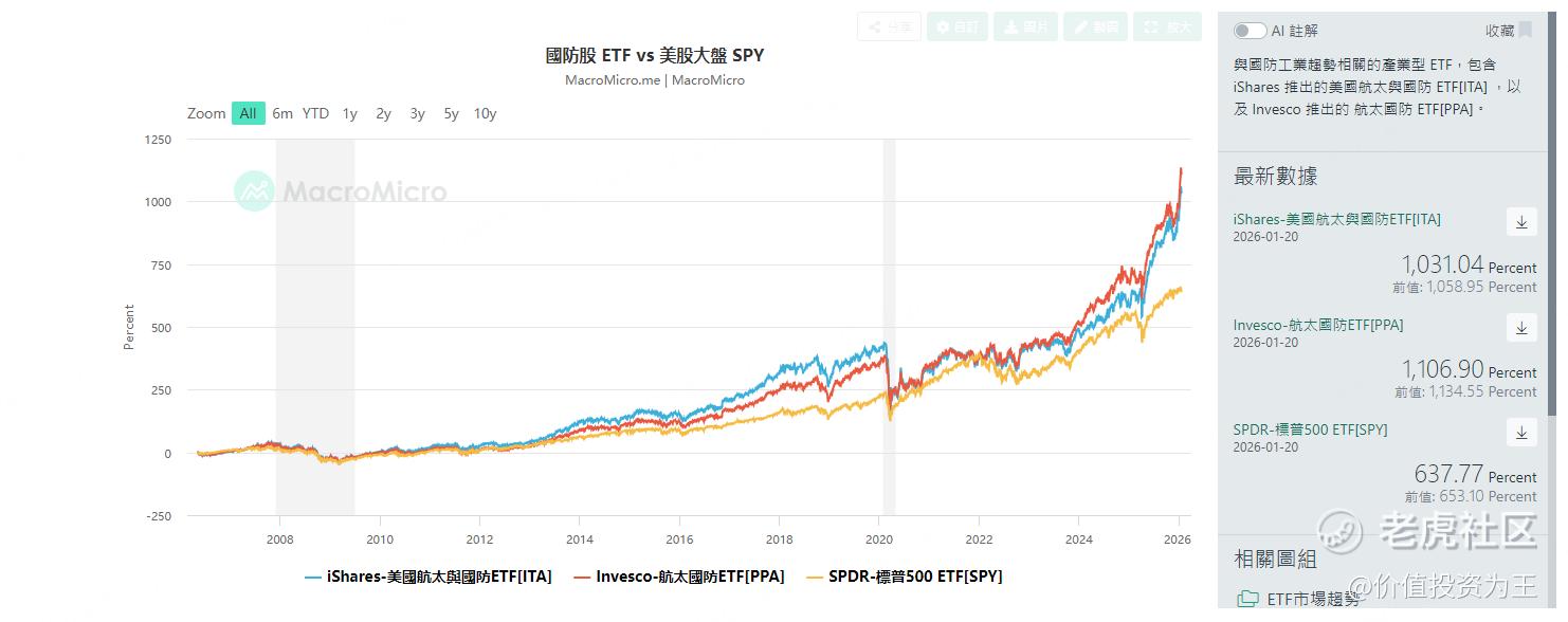 美国现在ETF的规模超过13万亿美元,占全球总规模的近70%。 军工ETF的表现竟然跑赢了标普500指数: $标普500(.SPX)$ $iShares Dow Jones U.S. Aerospace(ITA)$ $国防航太ETF-PowerShares(PPA)$