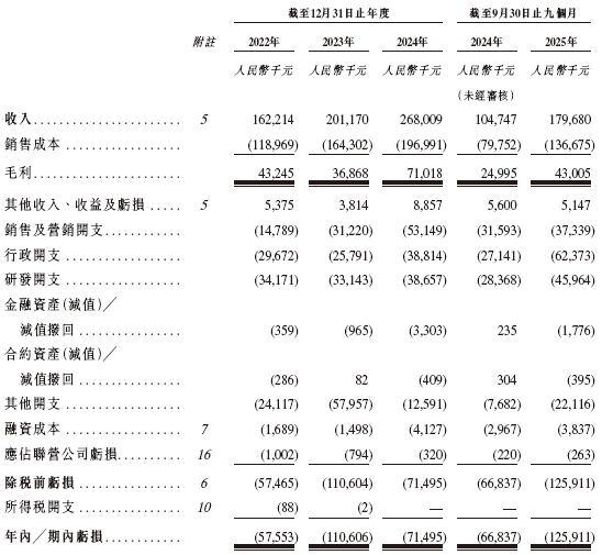 招股书显示,在过去的2022年、2023年、2024年和2025年前九个月,翼菲智能的营业收入分别为人民币1.62亿、2.01亿、2.68亿和1.80亿元,相应的净亏损分别为人民币0.58亿、1.11亿、0.71亿和1.26亿元。
