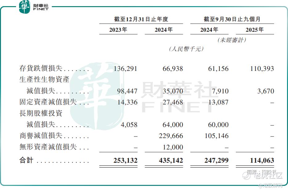 君乐宝的资产减值损失包括存货跌价损失、生产性生物资产减值损失、固定资产减值损失、长期股权投资减值损失、商誉减值损失,以及无形资产减值损失。而在2023年、2024年及2025年前三季度,君乐宝均产生了资产减值损失,其中商誉减值方面值得重点关注,经过2024年减值之后,截至2025年9月末,其账上商誉仍超过5亿元。