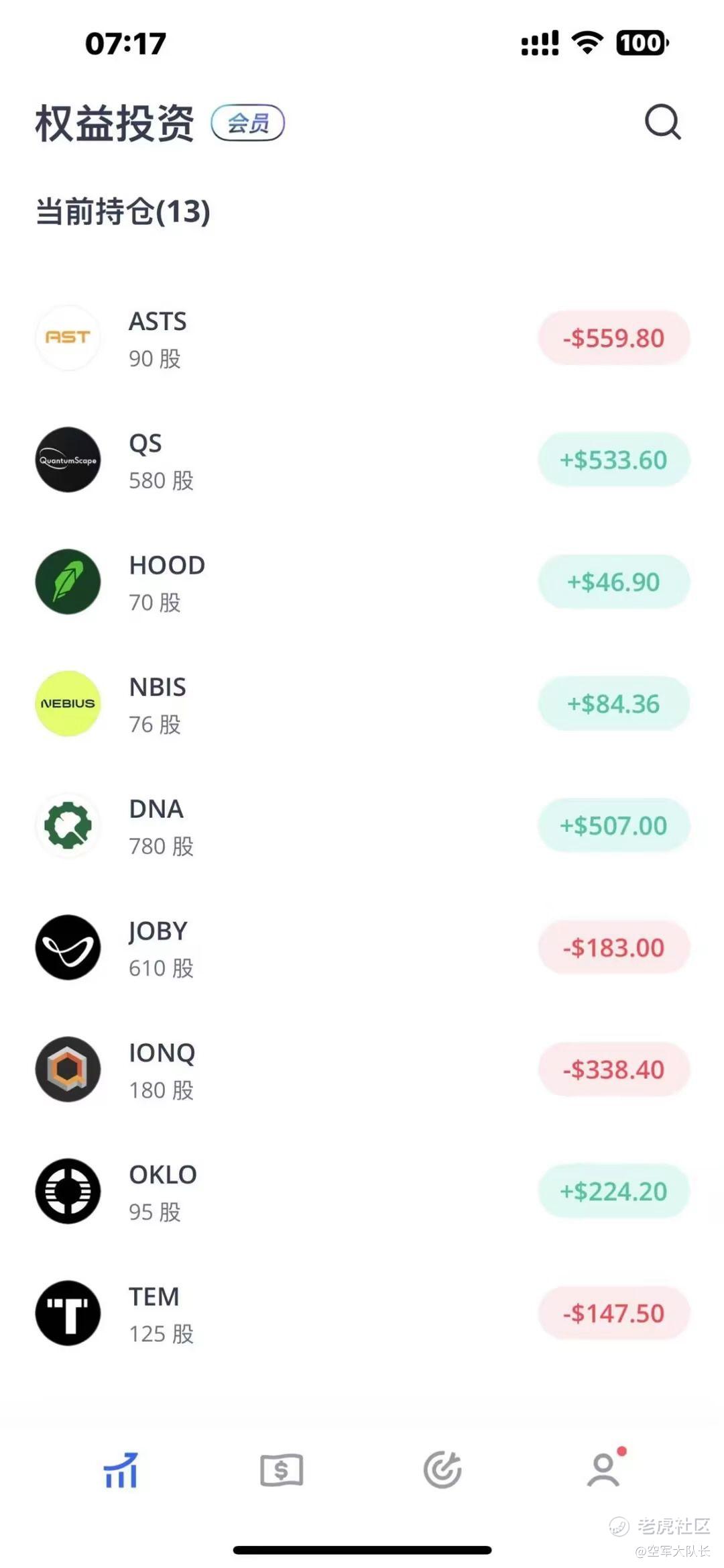 我现在推荐的就是没有涨的DNA,QS,IONQ,JOBY这四个股票,这四个股票大家也看到了,大跌的时候也不怎么跌了,DNA跟QS就大涨了一下,这种在底部的股票安全性高,就是下跌的空间不大。