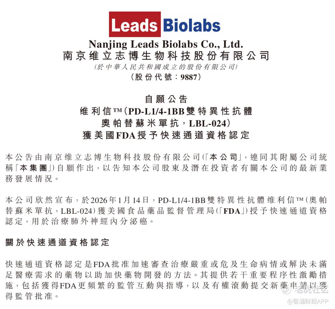 1 月 14 日晚,维立志博 - B (09887) $维立志博-B(09887)$ 发布公告,宣布其在研核心品种抗 PD-L1/4-1BB 双特异性抗体维利信 ®(LBL-024) 获得美国食品药品监督管理局 (FDA) 授予快速通道资格认定,用于治疗肺外神经内分泌癌 (EP-NEC)。
