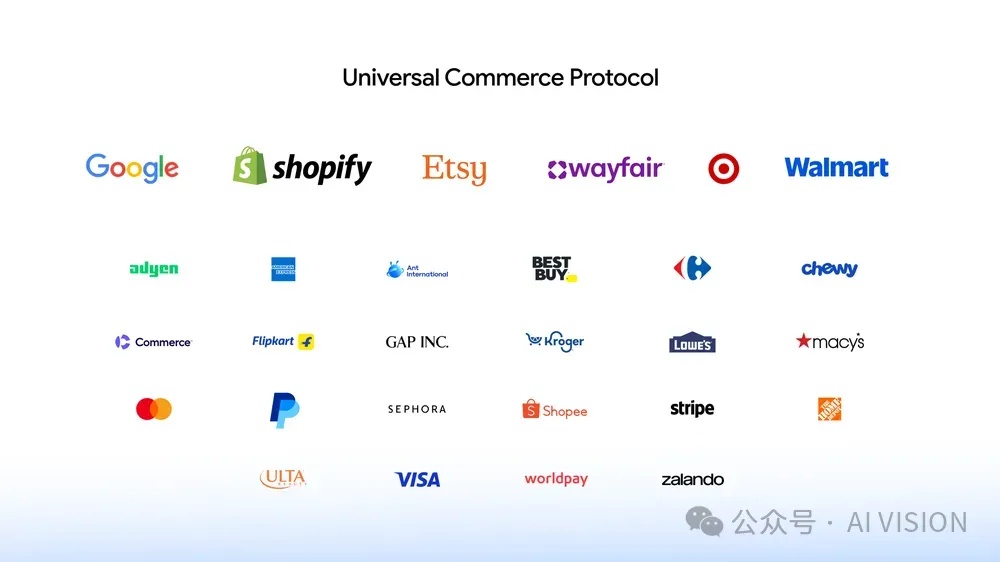 谷歌手握AI流量入口,互联网世界,流量就意味着“利益”,自然能吸引到诸多合作伙伴的加入。UCP目前合作伙伴阵容可谓是相当的豪华,已经囊括了海外诸多大型电商平台和支付工具。UCP是由 Google 与 Shopify、Etsy、Wayfair、Target 和 Walmart 等行业领导者合作开发,并得到了 Adyen、美国运通、百思买、Flipkart、梅西百货、万事达卡、Stripe、家得宝、Visa、Zalando 等 20 多家全球合作伙伴的认可。