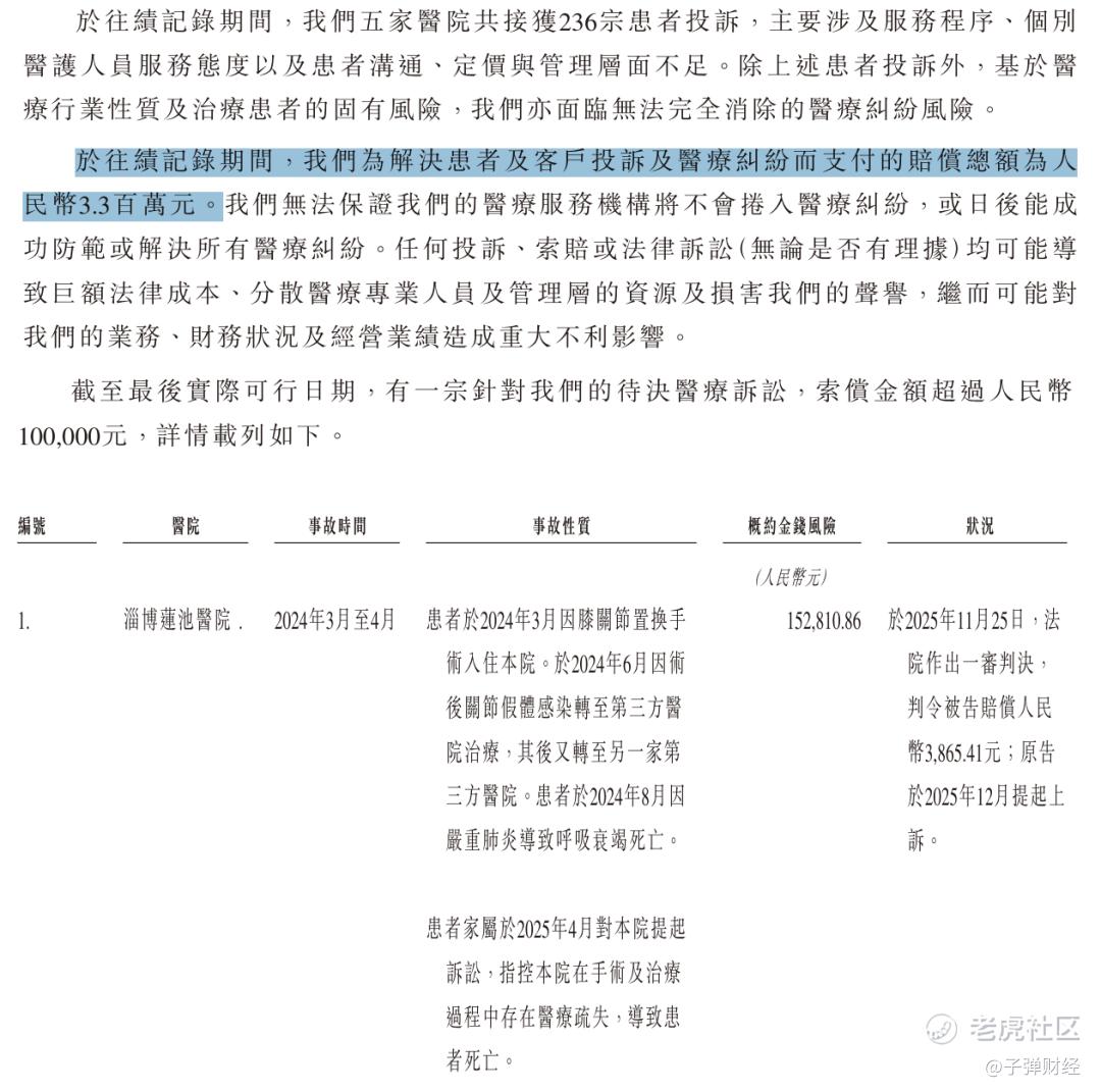 历史数据显示,旗下五家医院此前累计收到患者投诉236宗,为解决患者及客户投诉及医疗纠纷而支付的赔偿总额为330万元。此外,目前,公司还有一宗待解决的医疗诉讼,索偿金额超过10万元。