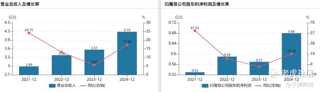 收购完成后,公司业绩呈现整体增长态势。公司营收从2021年的2.99亿元增长至2024年的4.19亿元,归母净利润从2021年的0.53亿元增至2024年的0.68亿元,尽管增速存在阶段性波动,但2024年的加速回升印证了增长动能的恢复。