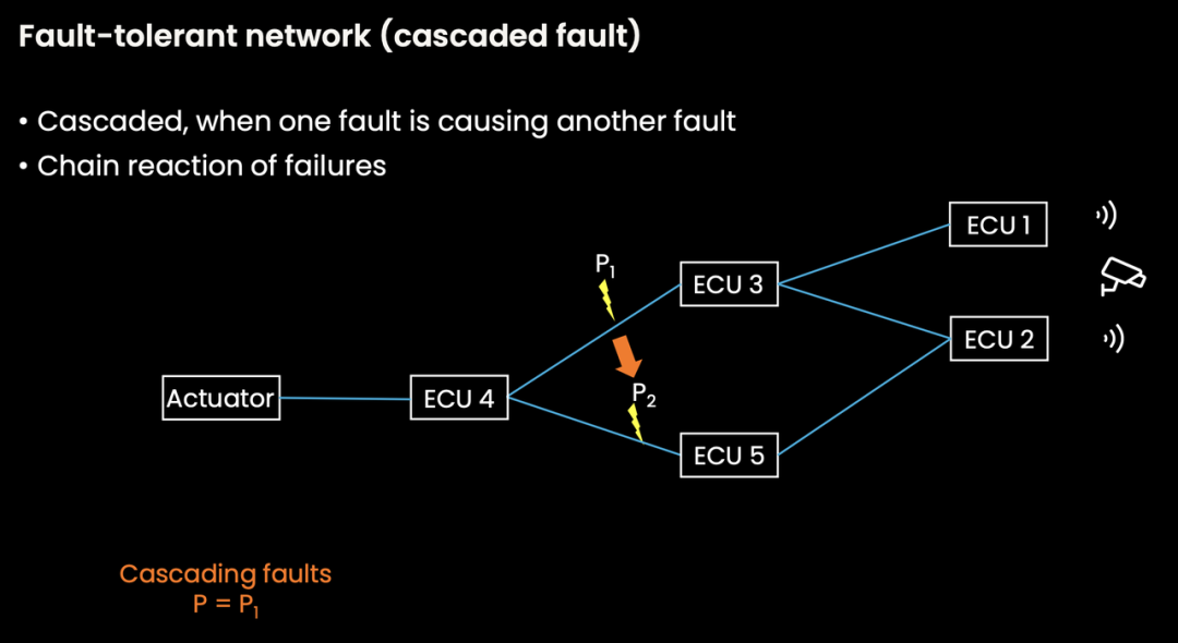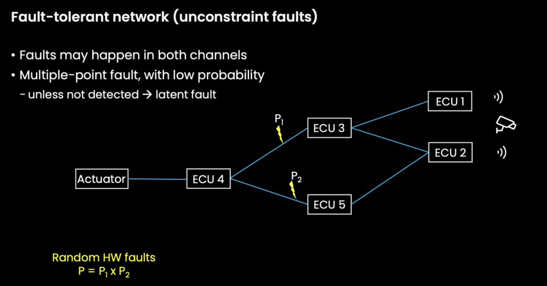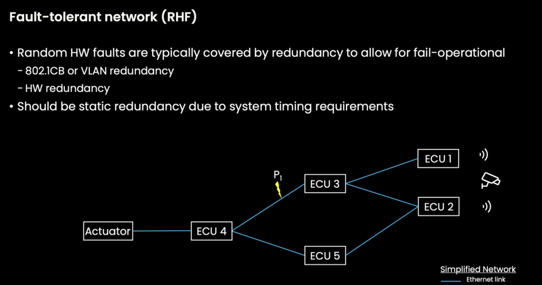 为了应对随机硬件故障,汽车以太网通常采用静态冗余架构,例如通过双路径网络、802.1CB帧复制与消除或VLAN冗余机制,实现通信链路和节点的备份。当主路径发生故障时,系统可以无缝切换到备用路径,保持数据传输不中断。