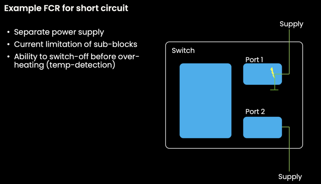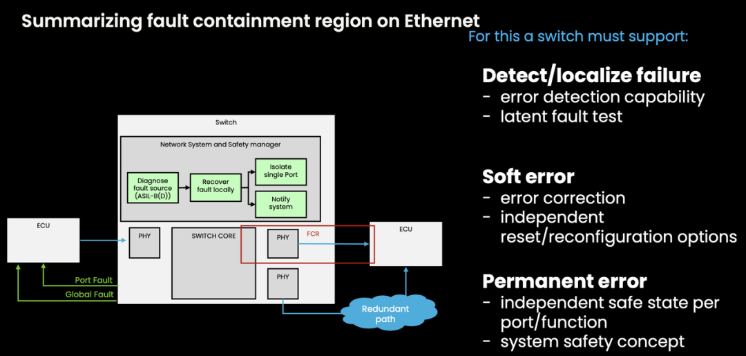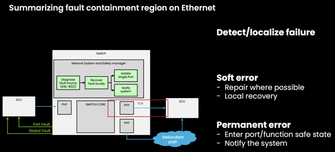 从系统层面看,具备FCR能力的以太网交换机必须支持四项核心功能:故障检测与定位、故障隔离、诊断以及本地恢复,交换机还需要将故障源信息上报给整车安全管理系统,满足ASIL-B(D)等级的系统性能力要求。
