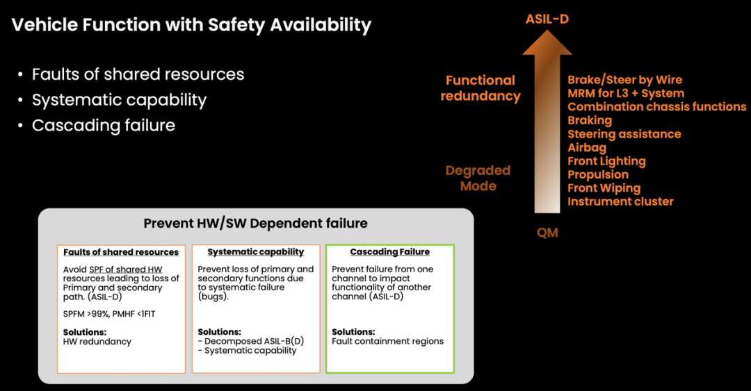 在高ASIL等级功能中,如线控制动、线控转向或L3最小风险机动,系统必须同时满足极低的危险失效概率(PMHF < 1 FIT)和极高的单点故障覆盖率(SPFM > 99%)。