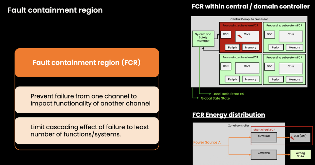 在中央或域控制器内部,将处理器划分为多个独立的子系统FCR,每个子系统包含自己的CPU核心、数据存储和外设资源,并由安全管理器统一协调。