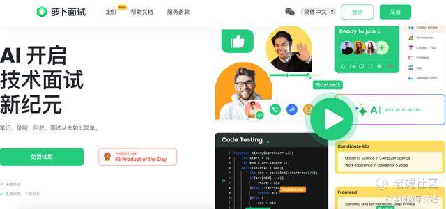 萝卜面试自动为面试官记录编码问题并实时转录面试过程,让面试官专注于候选人的表现。
