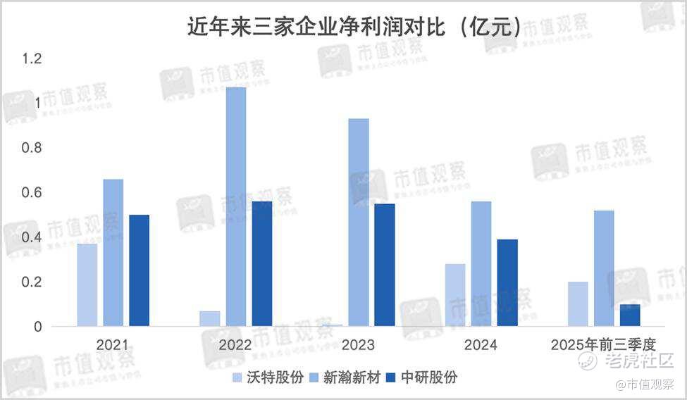 从财务对比来看,2025年前三季度沃特股份的收入规模最高但盈利能力较低,实现归母净利润0.3亿,净利润率仅2.14%,而中研股份和新瀚新材的净利润率分别为5.04%和15.62%。