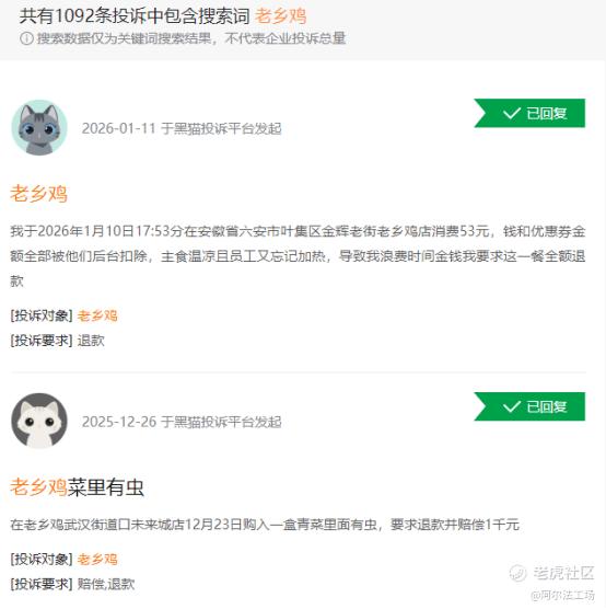 在黑猫投诉平台上,老乡鸡的投诉次条超1000条,主要投诉聚焦于食品卫生、食材质量等问题。