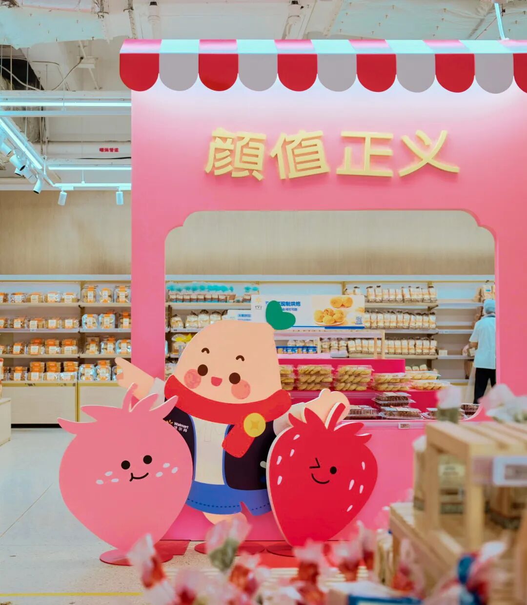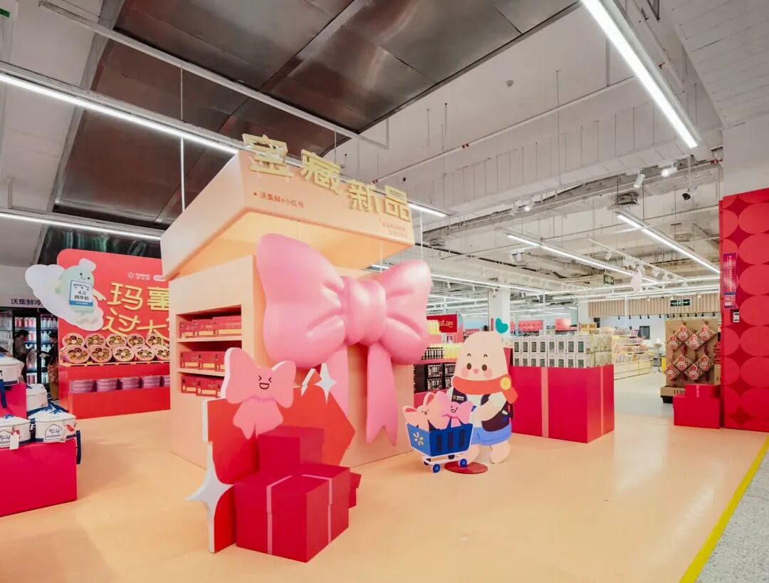深圳蛇口,一家开业26年的沃尔玛门口,“在沃尔玛寻宝,发小红书种草”的红色展板前人头攒动,吸引来往顾客拍照、讨论。走进店内,原先的货架陈列被重新规划成 8 个色彩鲜明的 “兴趣岛”,包括坚果礼盒、造型别致的“星球太空酥”礼盒等在内,近 20 款联名商品如“惊喜掉落”般散藏于其中。
