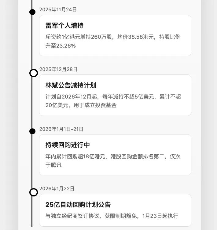 就在三周前的12月28日,小米副董事长林斌公告计划自2026年12月起,分四年减持不超过20亿美元股份。这是小米史上最大规模的高管减持计划。