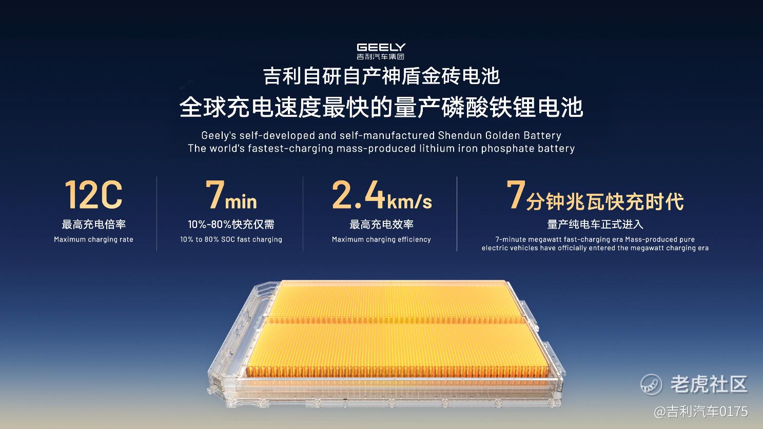在动力电池领域,吉利神盾金砖电池最高充电倍率可达12C,是目前全球充电速度最快的量产磷酸铁锂电池,10%~80%电量补能最快仅需7分钟,推动量产纯电车进入“7分钟兆瓦快充时代”。