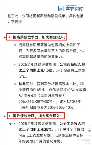 此前为更好地吸引、激励和保留优秀人才,字节跳动已经加大人才投入,确保员工薪酬竞争力和激励回报在各个市场都领先于头部水平。调薪投入将比上个周期上涨1.5倍。同时,薪酬发放将提高现金占比,减少期权/RSU占比。绩效奖金方面,公司奖金投入将比上个周期上涨35%,用于提升全年绩效M及以上的激励月数。