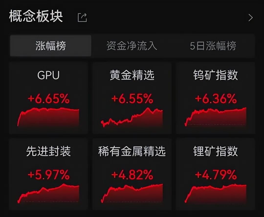 概念板块中,GPU暴涨6.65%,黄金、钨矿、先进封装全线领涨。
