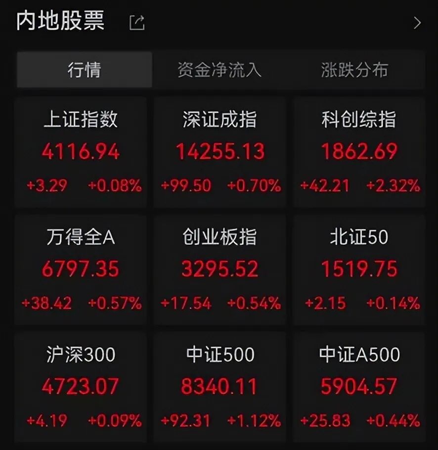 早盘三大指数象征性低开了一阵,随后便一路逆势上攻,丝毫不给空头机会。截至收盘,上证指数、深成指、沪深300都是红的,科创50更是一骑绝尘,暴涨3.48%!