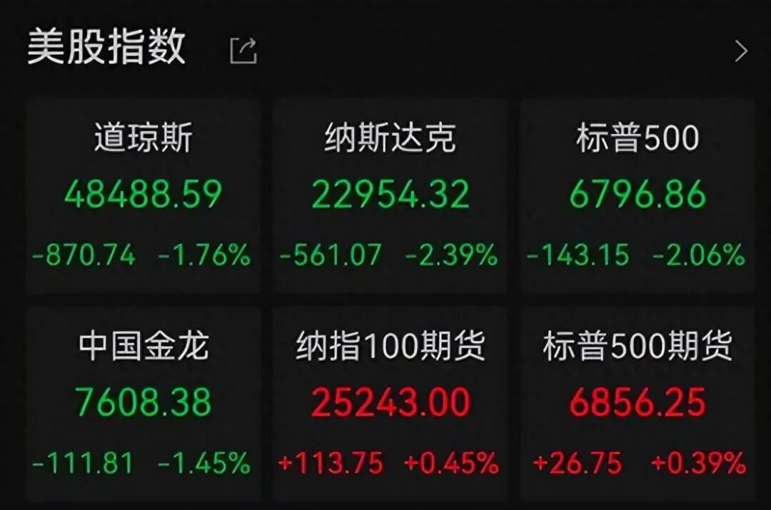 美股集体跳水,纳斯达克指数下跌2.39%,标普500下跌2.06%,道琼斯指数下跌1.76%。