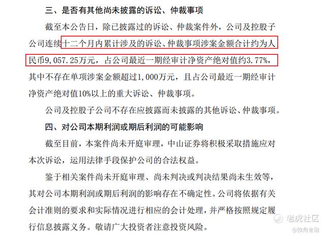 锦龙股份同时披露,剔除上述重大诉讼后,中山证券在过去12个月内累计涉及的诉讼、仲裁事项涉案金额约为9057.25万元,占锦龙股份最近一期经审计净资产绝对值的3.77%。