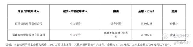 其中,中山证券作为被告,还与百瑞信托、福建海峡银行存在纠纷,案由分别为证券纠纷和金融委托理财合同纠纷,涉诉金额分别为5603.38万元、3406.49万元,目前,两起案件均未作出裁定。
