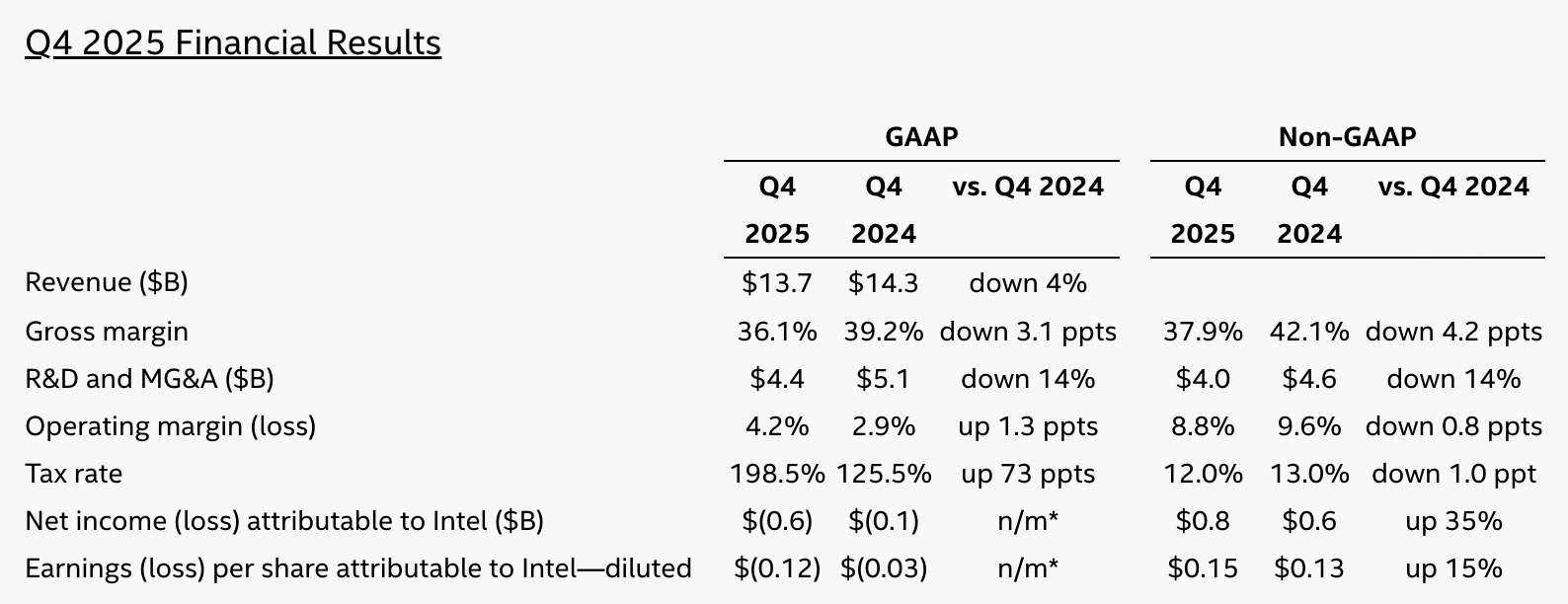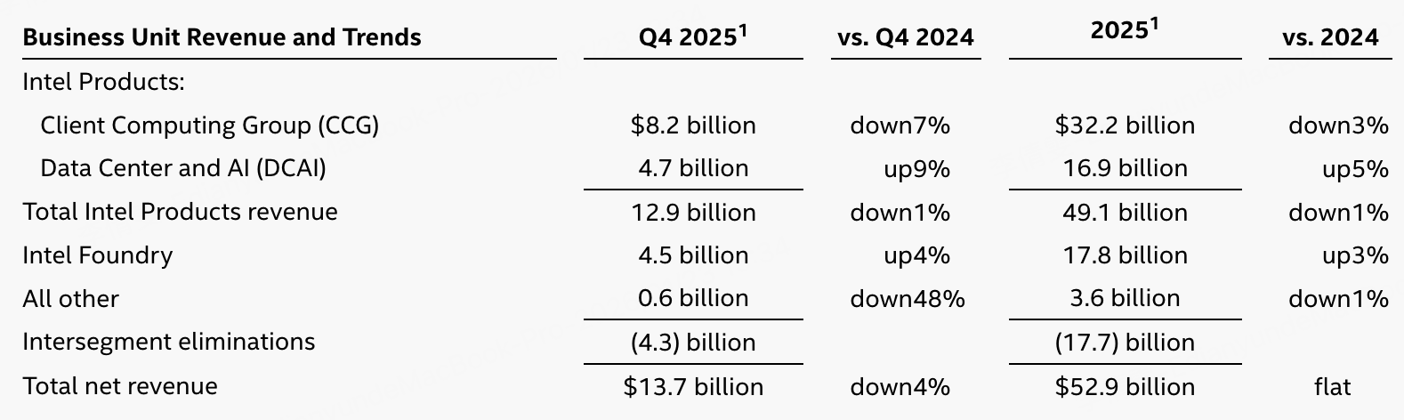CCG(PC/客户端)Q4 82 亿美元,同比 -7%。这块还是英特尔的基本盘,基本盘不回暖,市场很难给你高估值。