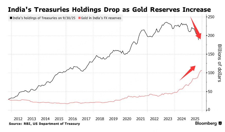 其次,根据彭博的报道,印度最新一个月又大笔抛售了美债,目前印度持有的美国国债已经降到了五年来的最低水平,根据上周公布的数据显示,印度持有的美国长期债已经降到了1740亿美元,教2023年的峰值下跌了26%,一年前美国国债占印度外汇储备的占比还是40%,目前只有三分之一,而印度持有的美国国债仅**国持有量的四分之一。看来印度比中国和日本还狠啊,出手就是大抛售,从地缘环境看,其实印度和美国没有正治方面的博弈,那么抛售可能仅仅就是认为美债不值钱或者有风险而已。