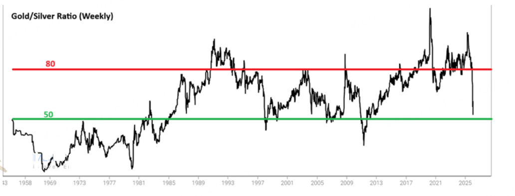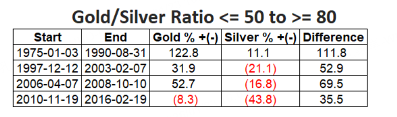 这个时候,历史上,金银的强弱可能会发生切换,由金弱银强切换到金强银弱,我们看统计得出的四次金银比跌破50的情况