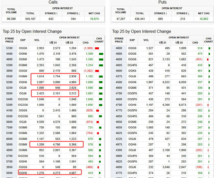 都是黄金涨的比白银猛,那么我们预计,暂时我们把白银的顶部看到130以上,那么这个过程中,黄金可能会加速,就像高盛说的,会往5400上逼近,目前黄金期货期权的价外的押注,已经有大量的资金押注到了5000以上。