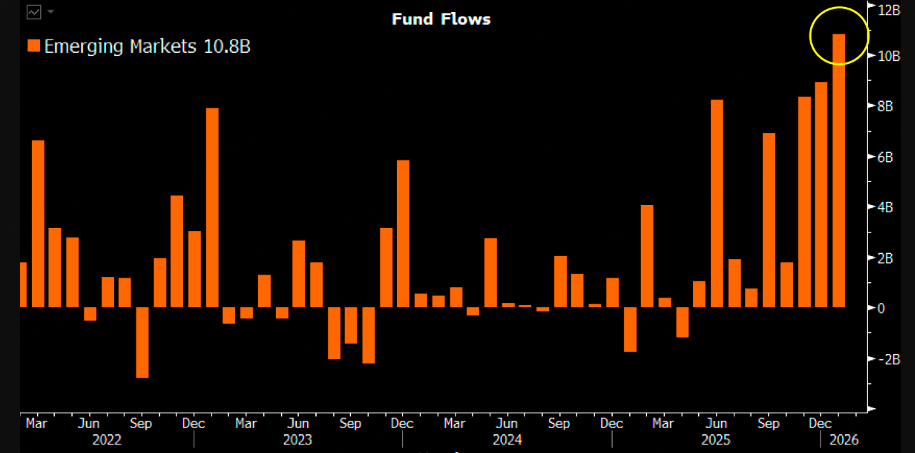美元一下子这么弱势,确实让人感觉很奇怪,资金近一年来都在往大宗商品和新兴市场上跑: