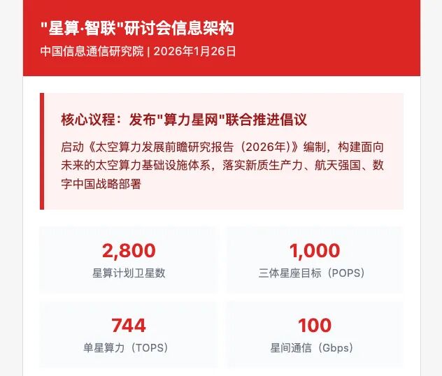 1月23日金十数据消息,中国信息通信研究院将于1月26日召开2026年"星算·智联"太空算力研讨会,正式发布"算力星网"联合推进倡议。