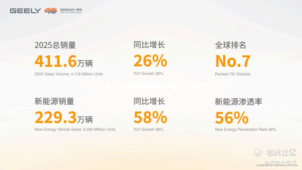 全年总销量达到411.6万辆,同比增长26%,连续五年保持高速增长;新能源销量229.3万辆,同比增长高达58%,新能源渗透率首次站上56%;在全球汽车集团中,吉利已经冲到第七位,而且是前十名里增速最快的那一个。