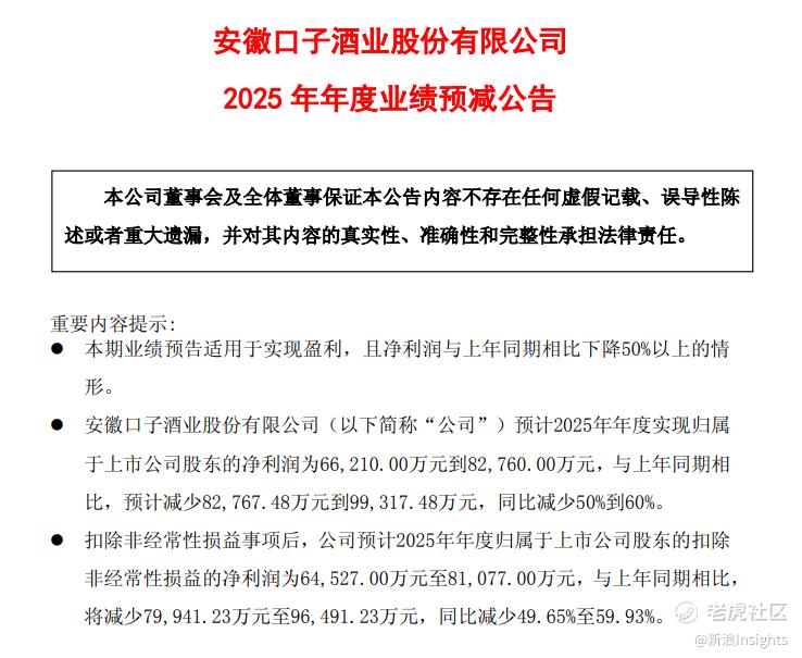 安徽老牌酒企口子窖公布的业绩预告显示,预计2025年度归母净利润同比腰斩,创下了口子窖2015年上市以来的最差纪录。