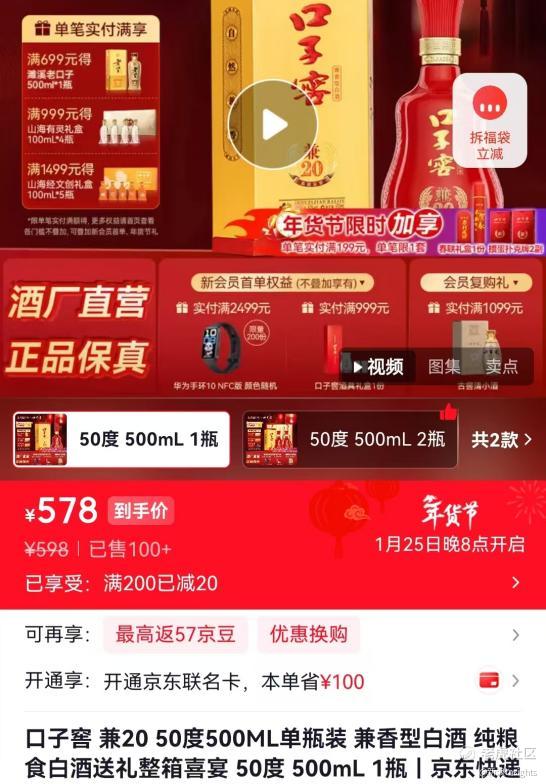 同时,口子窖还在动销不畅、价格倒挂的泥潭里挣扎,其核心产品兼系列、年份系列均出现价格下探现象。例如核心单品兼20系列50度产品,其官方建议零售价为698元/瓶,但在电商平台口子窖官方旗舰店,到手价仅为578元/瓶,价格倒挂幅度为17%。