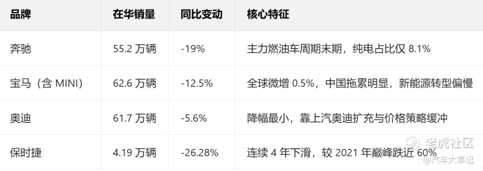 数据不会说谎:BBA在华累计销量同比下滑12.3%,减少近26万辆回落至2017—2018年水平;保时捷全年交付4.19万辆,同比骤降26.28%,连续四年下滑且较2021年峰值跌幅近六成。值得注意的是,此次寒冬并非偶然,而是传统品牌转型滞后、本土高端新能源分流、全球战略与中国需求脱节三大因素叠加的必然结果。