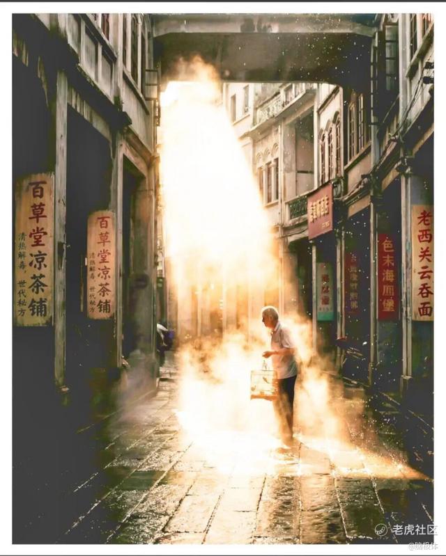 结果公示初期,大家都被这张老照片特有的质感打动了。暖黄色的色调营造出怀旧的氛围、构图稳重,楼房阴影处泄露的光线在老旧的建筑上切割出丰富的光影层次,前景的老人提着鸟笼,似乎正在诉说着老街的闲适。