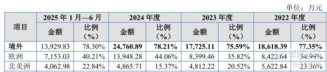 其中,欧洲和北美洲是主阵地,欧洲、北美洲的合计销售额占主营业务收入的比例分别为58.35%、56.34%、59.43%、63.04%。