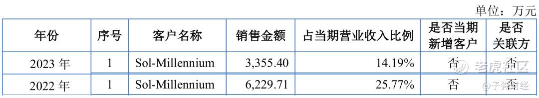 招股书显示,2023年,公司向Sol-Millennium的销售额为3355.40万元,同比下滑46%。
